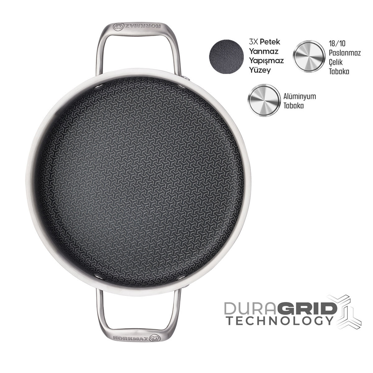 Tri-ply Duragrid Teknolojisi: İç yüzeydeki petek dokulu yapışmaz kaplama, yumurta ve peynir gibi hassas gıdaların yüzeye yapışmasını önler. Çok az yağ ile kusursuz omletler hazırlamanıza imkan tanır. 3 katmanlı, lazer kazıma yöntemi ile petek kaplamalı olarak yapılmış üstün çelik teknolojisine sahip, çizilmelere karşı extra dayanıklı tava